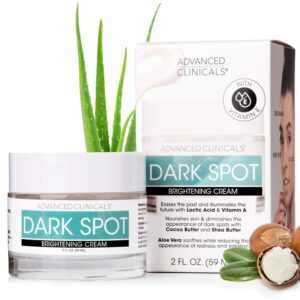 - EFFECTIVE ANTI-AGING INGREDIENTS – Advanced Clinicals Dark Spot Brightening Face Cream is formulated with the perfect combination of effective anti aging + brightening ingredients, including Retinol, Vitamin C, Lactic Acid, Cocoa Butter, Green Tea Extract, Caffeine, Vitamin E, & More. Retinol effectively firms and tightens skin, while Vitamin C helps promote an even skin tone, while also helping stimulate collagen production to improve skin elasticity + firmness.