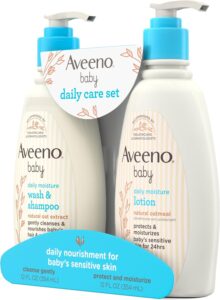 - Aveeno Baby Daily Care Gift Set contains one 12-fluid ounce bottle of Aveeno 2-in-1 Baby Bath Wash & Shampoo & one 12-fluid ounce bottle of Aveeno Baby Moisturizing Body Lotion for daily nourishment of your baby’s sensitive skin & hair