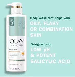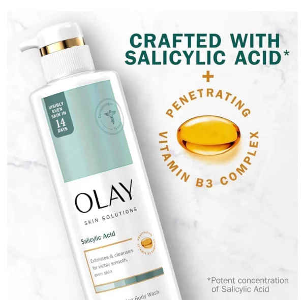 Olay Skin Solutions Hydrating Body Wash with Salicylic Acid is a daily body cleanser designed to gently exfoliate, hydrate and support smoother-looking skin. The formula cleanses effectively while helping to maintain skin comfort during and after use.
