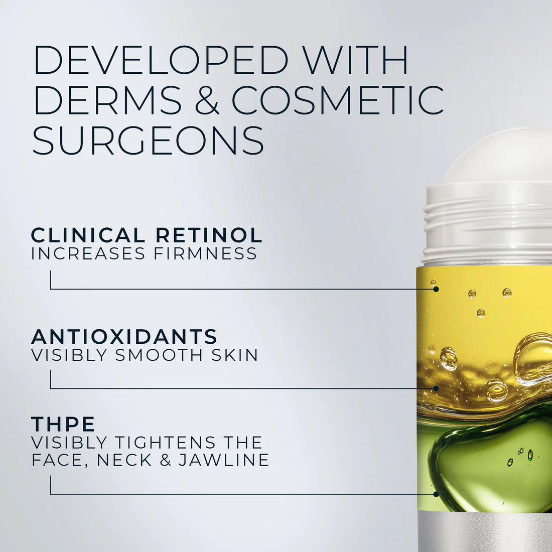 RoC’s new Derm Correxion Firming Serum Stick tightens the face & neck in seconds for dramatically firmer skin. Ultra firming THPE + Antioxidants work alongside the #1 most awarded Retinol* to boost elasticity for younger-looking skin with naturally enhanced contours. In minutes, increase firmness by +90%**. In 4 weeks, 94% had a visibly firmer face & neck. Dermatologist tested. Fragrance-Free. Paraben-free. Cruelty-free. Fast absorbing.